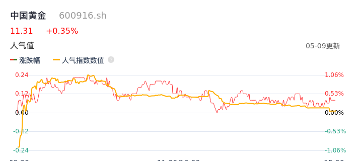 05月09日,中国黄金收报11.31,股价涨幅0.35%,成交金额1.46亿元,换手率0.77%。