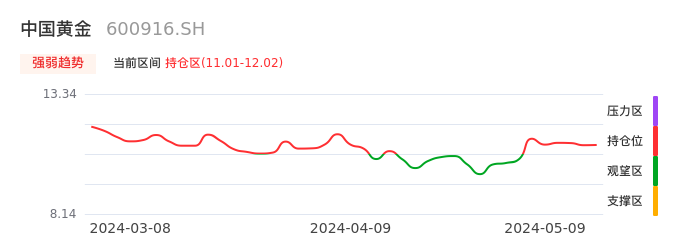 我们来看一下该股的九方特色指标强弱趋势的情况:中国黄金自04月29日从观望区上穿到持仓区。股价近期在多头区域持续强势上扬,上升动能仍较为充足,可积极关注。后续重点关注上方压力位:12.02元是否能突破上攻。