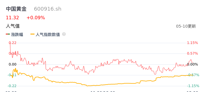 05月10日,中国黄金收报11.32,股价涨幅0.09%,成交金额1.89亿元,换手率0.99%。