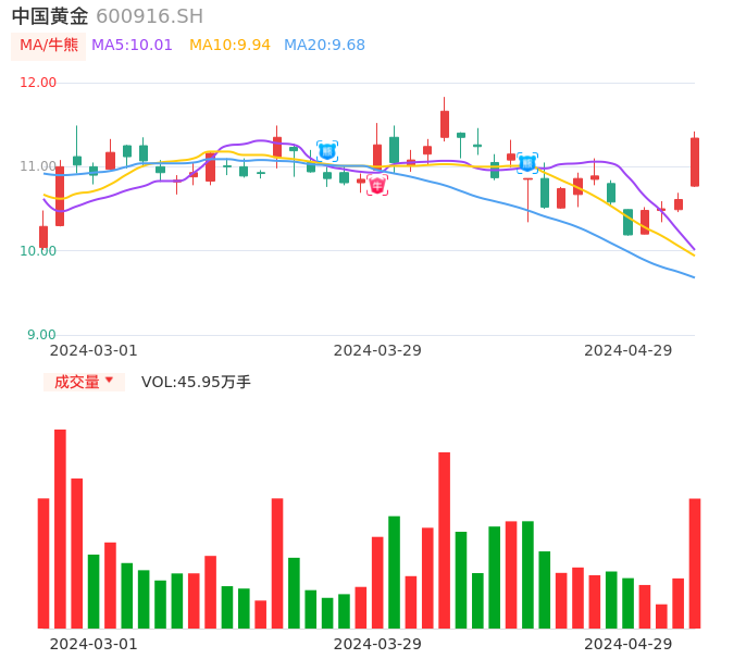 04月29日,中国黄金收报11.34,股价涨幅6.88%,成交金额5.12亿元,换手率2.74%。