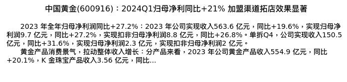 值得注意的是:2024年04月东吴证券的吴劲草/谭志千分析师,首次发布关于中国黄金的研究报告,标题为:中国黄金(600916):2024Q1归母净利同比+21% 加盟渠道拓店效果显著。