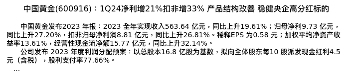 值得注意的是:2024年05月海通证券的李宏科/汪立亭分析师,首次发布关于中国黄金的研究报告,标题为:中国黄金(600916):1Q24净利增21%扣非增33% 产品结构改善 稳健央企高分红标的。