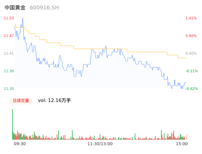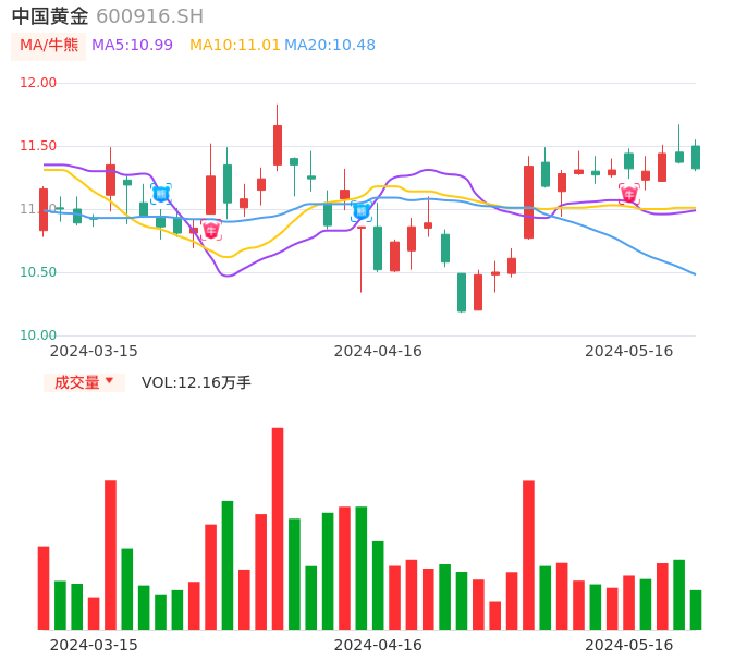 05月16日,中国黄金收报11.32,股价涨幅-0.44%,成交金额1.39亿元,换手率0.72%。