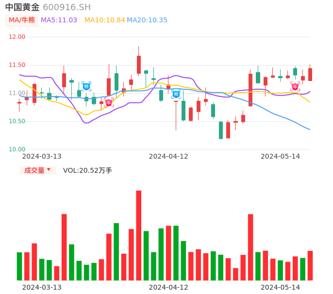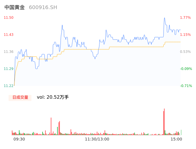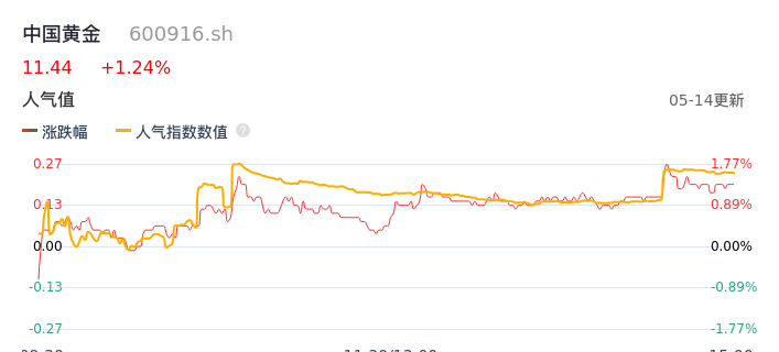 05月14日,中国黄金收报11.44,股价涨幅1.24%,成交金额2.34亿元,换手率1.22%。