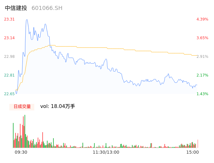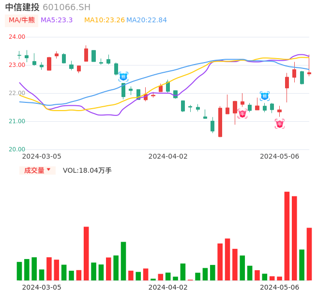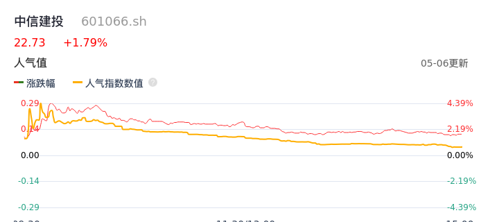 05月06日,中信建投收报22.73,股价涨幅1.79%,成交金额4.15亿元,换手率0.47%。