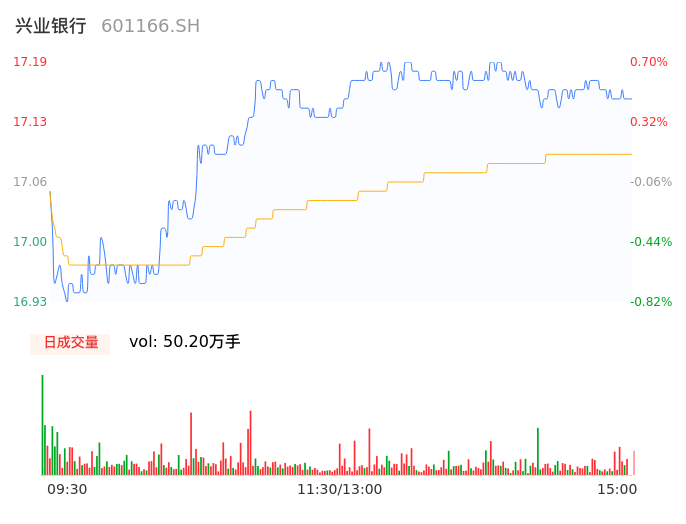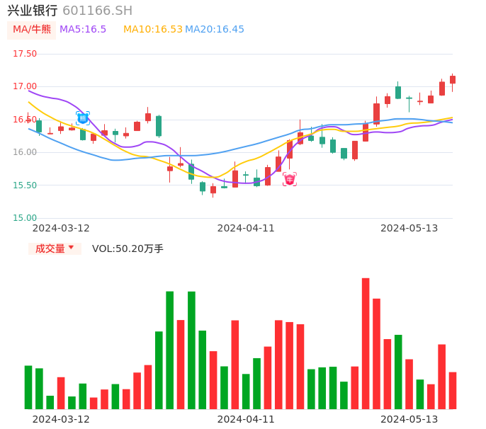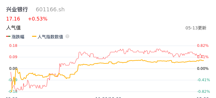 05月13日,兴业银行收报17.16,股价涨幅0.53%,成交金额8.58亿元,换手率0.24%。