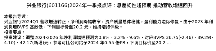 值得注意的是:2024年04月国泰君安的刘源分析师,首次发布关于兴业银行的研究报告,标题为:兴业银行(601166)2024年一季报点评:息差韧性超预期 推动营收增速回升。
