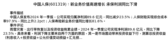 值得注意的是:2024年05月长江证券的吴一凡/谢宇尘/赵智勇分析师,首次发布关于中国人保的研究报告,标题为:中国人保(601319):新业务价值高速增长 承保利润同比下滑。