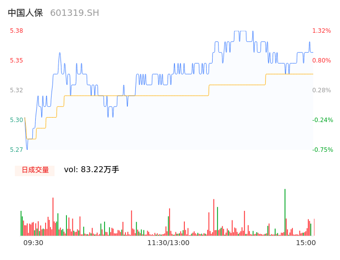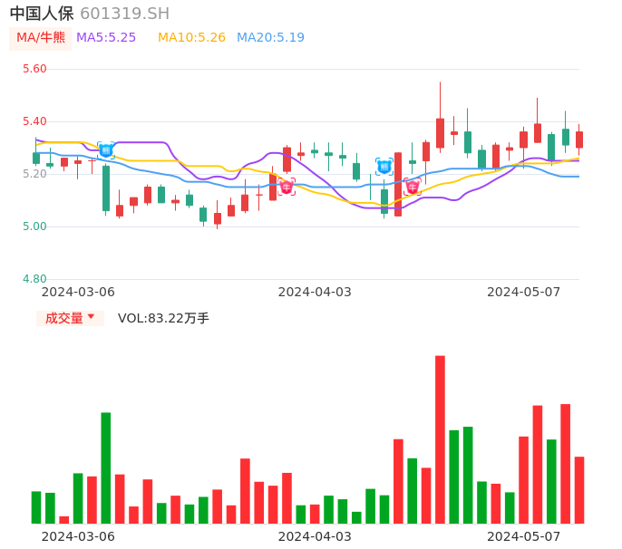 05月07日,中国人保收报5.36,股价涨幅0.94%,成交金额4.44亿元,换手率0.23%。