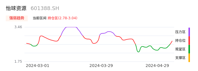 我们来看一下该股的九方特色指标强弱趋势的情况:怡球资源近日从观望区上穿到持仓区。股价短期站稳多头区域,上升动能仍较为充足,可积极关注。后续重点关注上方压力位:3.04元是否能突破上攻。