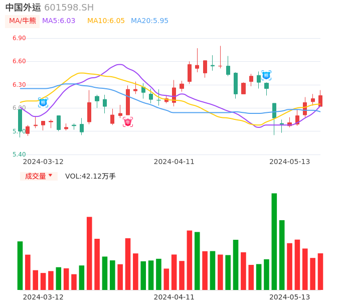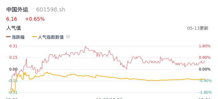 05月13日,中国外运收报6.16,股价涨幅0.65%,成交金额2.59亿元,换手率0.80%。