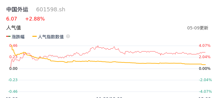 05月09日,中国外运收报6.07,股价涨幅2.88%,成交金额2.88亿元,换手率0.91%。