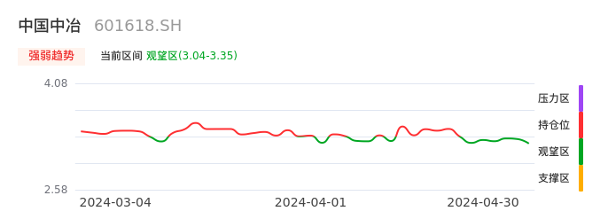 我们来看一下该股的九方特色指标强弱趋势的情况:中国中冶自04月22日从持仓区下穿到观望区,股价近期持续走弱。短期已经进入空头行情,且下跌动能仍未衰竭。建议继续谨慎观望。