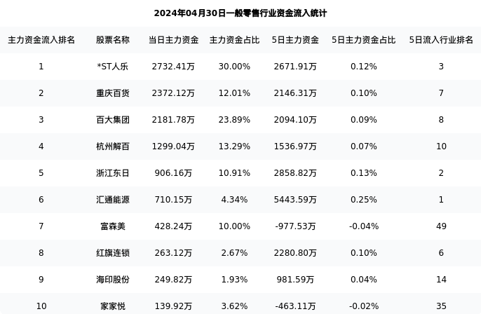 从主力资金流向来看,一般零售行业今日主力资金流入11.59亿元,在所有申万二级行业中排名:71/131。