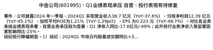 值得注意的是:2024年05月国投证券的张经纬分析师,首次发布关于中金公司的研究报告,标题为:中金公司(601995):Q1业绩表现承压 自营、投行表现有待修复。