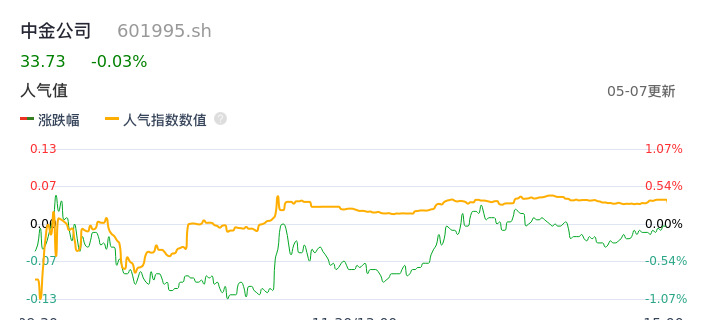 05月07日,中金公司收报33.73,股价涨幅-0.03%,成交金额4.86亿元,换手率0.49%。
