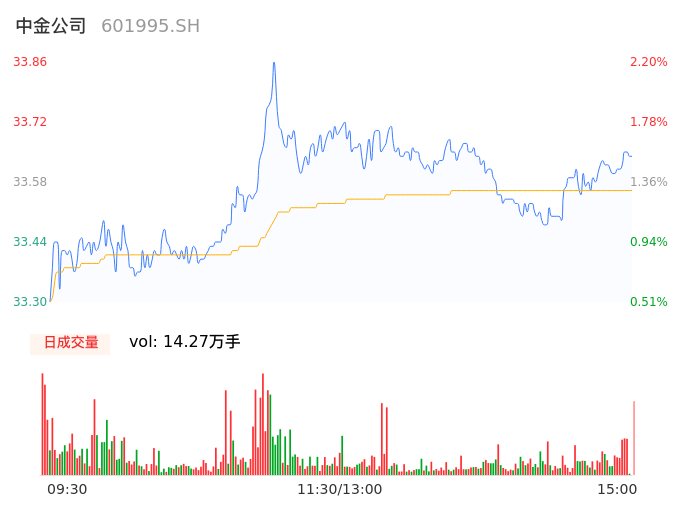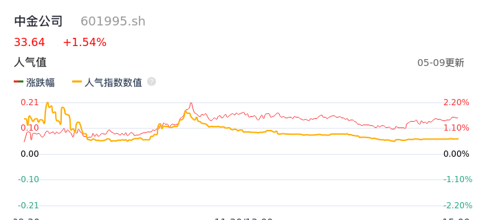 05月09日,中金公司收报33.64,股价涨幅1.54%,成交金额4.79亿元,换手率0.49%。