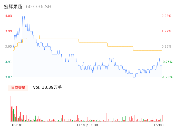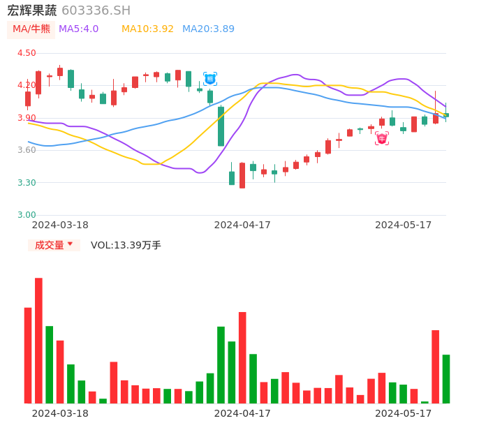 05月17日,宏辉果蔬收报3.91,股价涨幅-0.76%,成交金额5271.90万元,换手率2.35%。