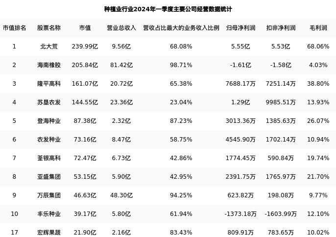 宏辉果蔬最新报告期数据为一季度,下表汇总了种植业行业内市值靠前的公司一季度主要经营数据