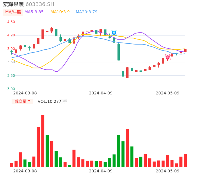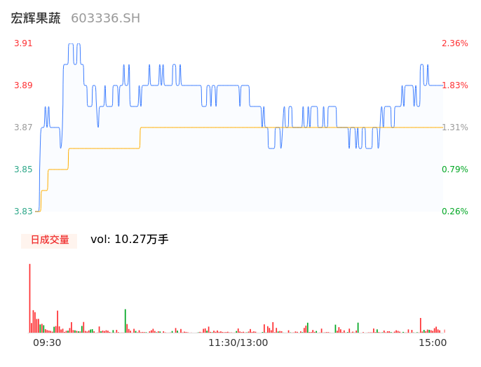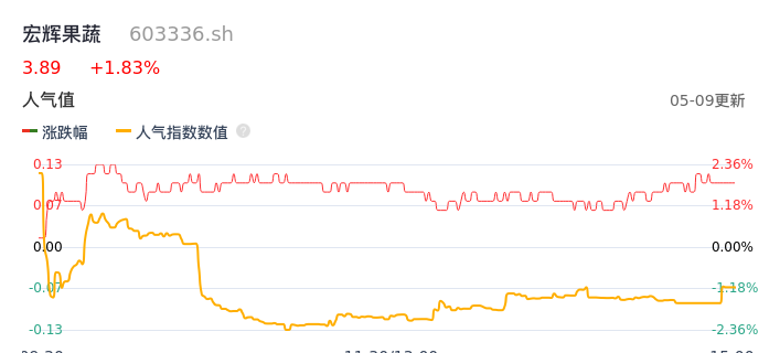 05月09日,宏辉果蔬收报3.89,股价涨幅1.83%,成交金额3976.60万元,换手率1.80%。