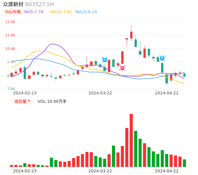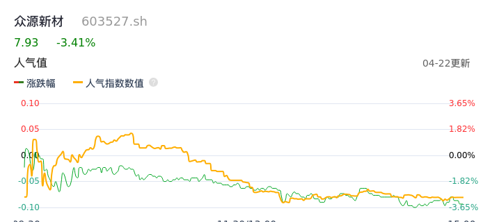 04月22日,众源新材收报7.93,股价涨幅-3.41%,成交金额8055.20万元,换手率3.15%。