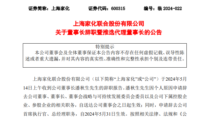上海家化今日晚间公告,14日上午收到公司董事长潘秋生的辞职报告。潘秋生因个人原因申请辞去公司董事、董事长、董事会战略与可持续发展委员会委员以及公司下属控股企业、参股企业的相关职务,自送达公司董事会之日起生效;同时,申请辞去公司首席执行官、总经理职务,自2024年5月31日生效。