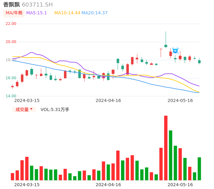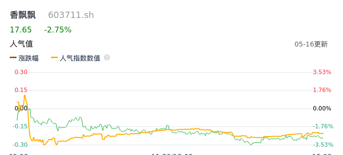 05月16日,香飘飘收报17.65,股价涨幅-2.75%,成交金额9405.20万元,换手率1.29%。