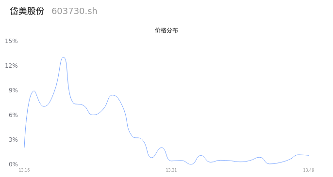 根据成交分布分析,该股票当天缩量成交,成交清淡。时间上看,早盘前半小时成交量占据当天总成交量的32.88%;价格上看,成交呈现左偏峰。成交分布分析主要研究股票成交的分布特性,不具有预测功能,请知悉。