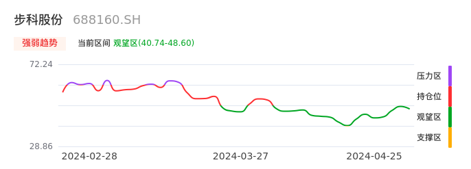 我们来看一下该股的九方特色指标强弱趋势的情况:步科股份自04月02日从持仓区下穿到观望区,股价近期持续走弱。短期已经进入空头行情,且下跌动能仍未衰竭。建议继续谨慎观望。