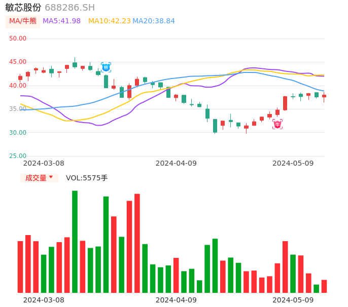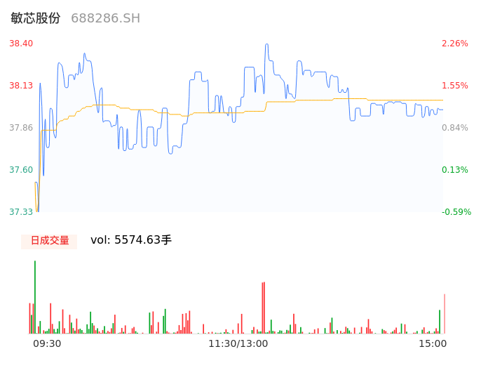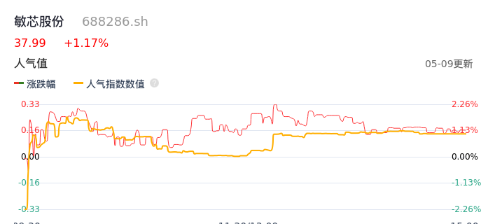 05月09日,敏芯股份收报37.99,股价涨幅1.17%,成交金额2120.30万元,换手率1.04%。