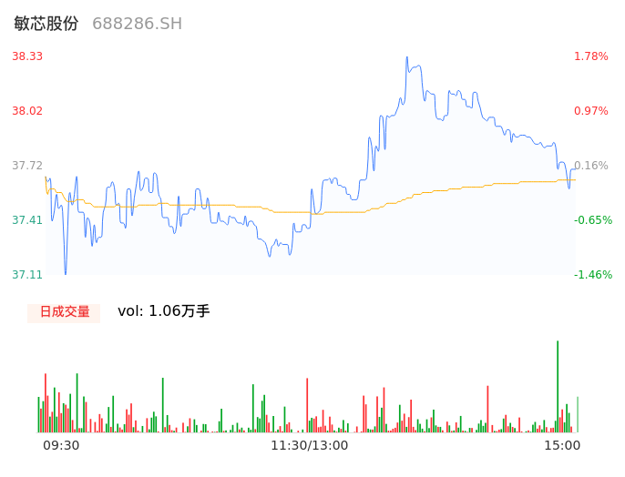 04月30日,敏芯股份收报37.58,股价涨幅-0.21%,成交金额3992.78万元,换手率1.98%。
