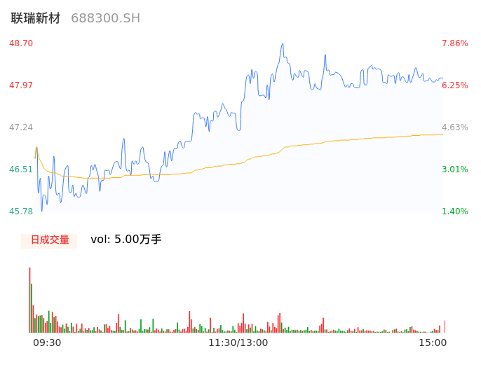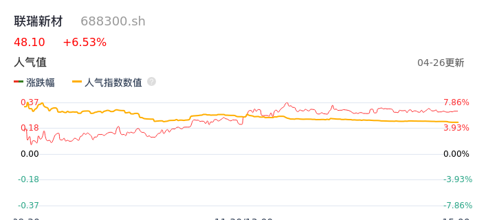 04月26日,联瑞新材收报48.10,股价涨幅6.53%,成交金额2.36亿元,换手率2.69%。