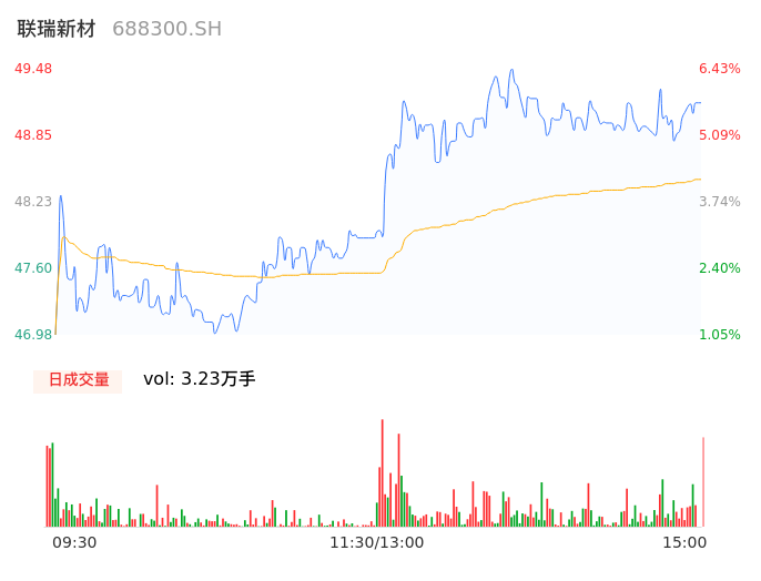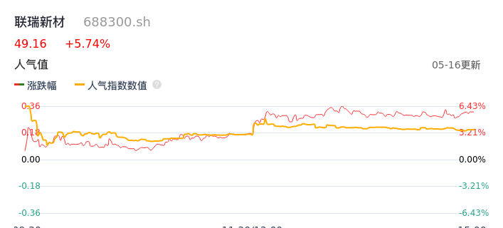 05月16日,联瑞新材收报49.16,股价涨幅5.74%,成交金额1.56亿元,换手率1.74%。