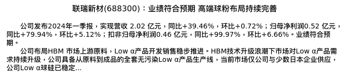 值得注意的是:2024年05月东北证券的伍豪分析师,首次发布关于联瑞新材的研究报告,标题为:联瑞新材(688300):业绩符合预期 高端球粉布局持续完善。