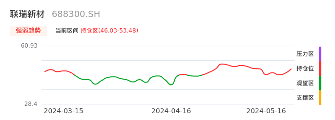 我们来看一下该股的九方特色指标强弱趋势的情况:联瑞新材自04月23日从观望区上穿到持仓区。股价近期在多头区域持续强势上扬,上升动能仍较为充足,可积极关注。后续重点关注上方压力位:53.48元是否能突破上攻。