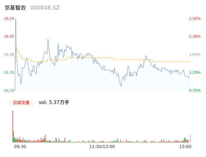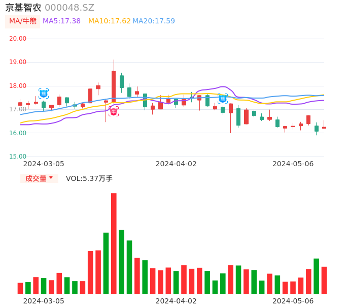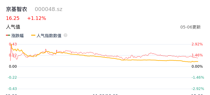 05月06日,京基智农收报16.25,股价涨幅1.12%,成交金额8765.91万元,换手率1.03%。