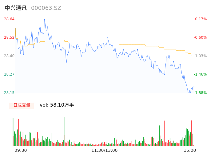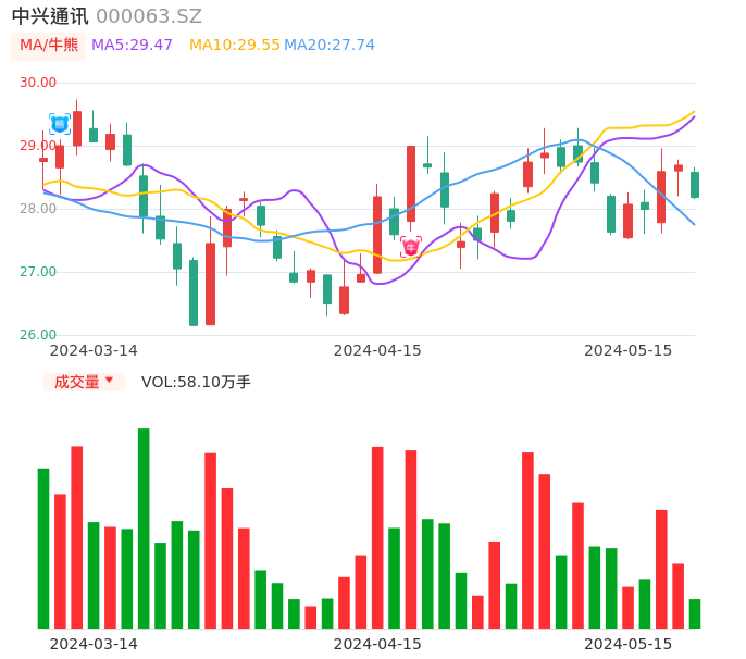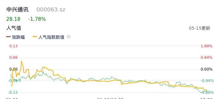 05月15日,中兴通讯收报28.18,股价涨幅-1.78%,成交金额16.50亿元,换手率1.44%。