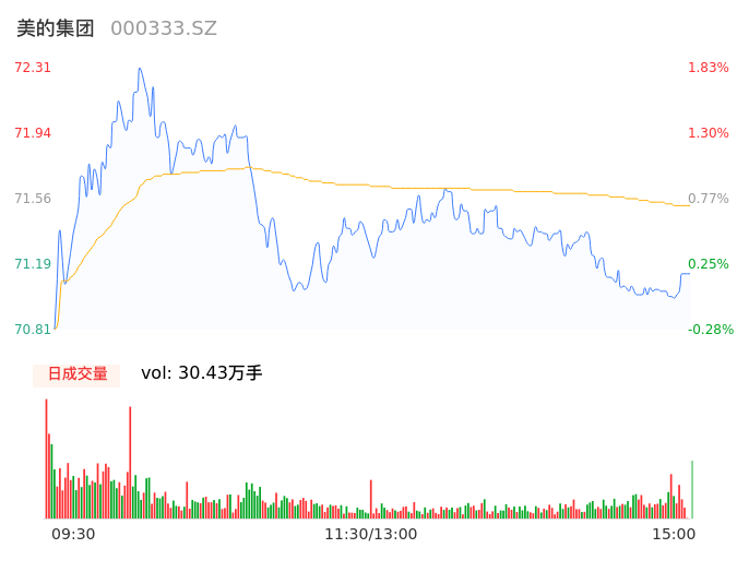 05月07日,美的集团收报71.10,股价涨幅0.13%,成交金额21.76亿元,换手率0.44%。