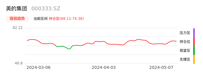 我们来看一下该股的九方特色指标强弱趋势的情况:美的集团自03月27日从观望区上穿到持仓区。股价近期在多头区域持续强势上扬,上升动能仍较为充足,可积极关注。后续重点关注上方压力位:74.36元是否能突破上攻。