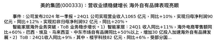 值得注意的是:2024年05月招商证券的史晋星/闫哲坤/彭子豪分析师,首次发布关于美的集团的研究报告,标题为:美的集团(000333):营收业绩稳健增长 海外自有品牌表现亮眼。