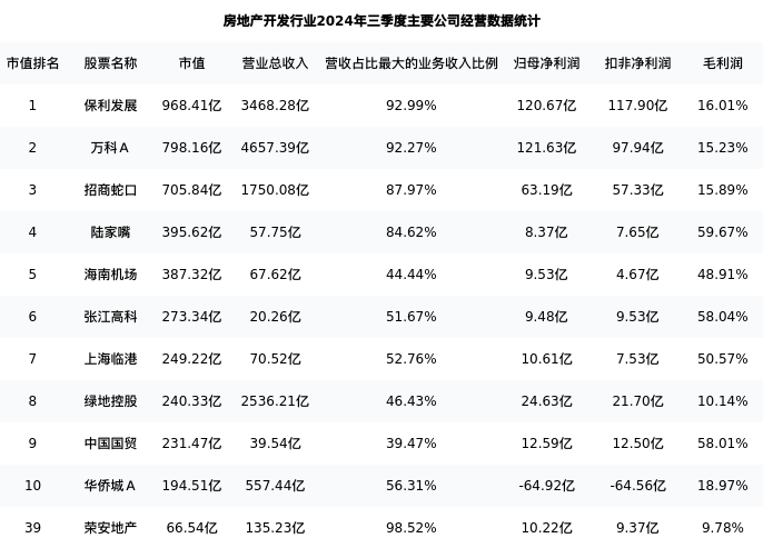 荣安地产最新报告期数据为三季度,下表汇总了房地产开发行业内市值靠前的公司三季度主要经营数据