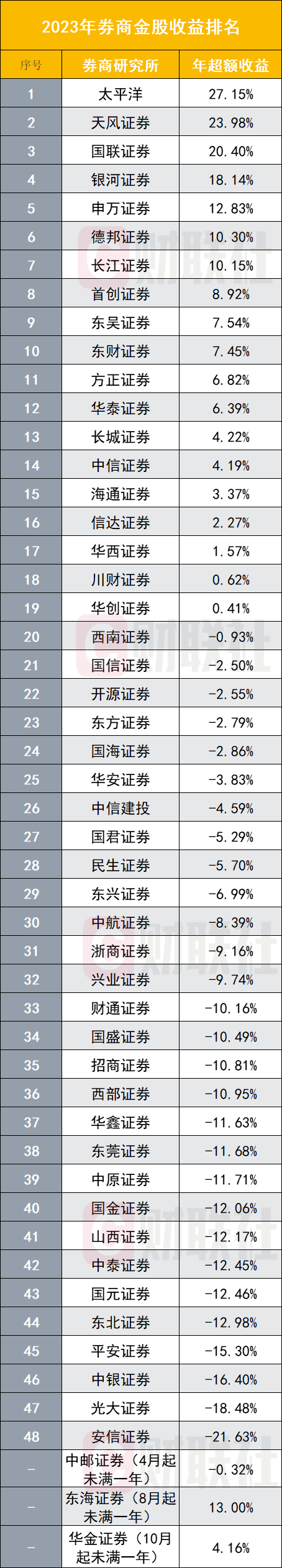 此外,30家券商金股2023年超额收益为负值,其中1家券商金股组合收益亏损幅度超过20%,16家券商金股收益亏损超过10%。