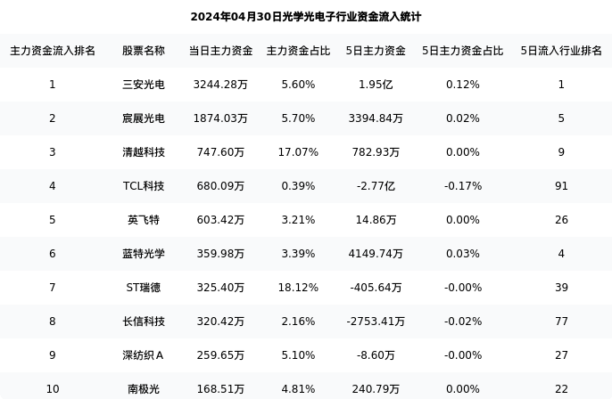 从主力资金流向来看,光学光电子行业今日主力资金流入48.82亿元,在所有申万二级行业中排名:114/131。