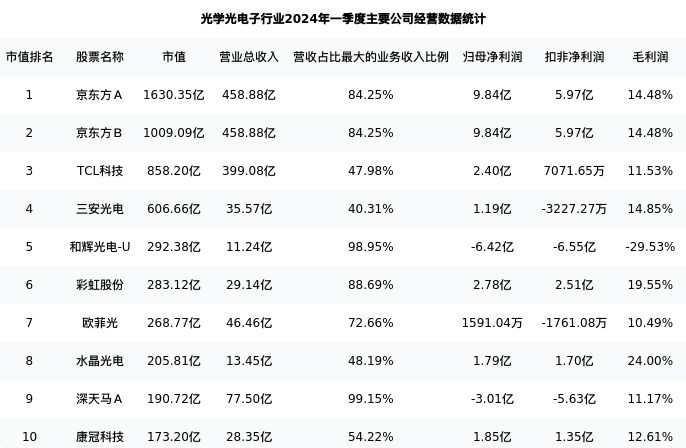京东方A最新报告期数据为一季度,下表汇总了光学光电子行业内市值靠前的公司一季度主要经营数据