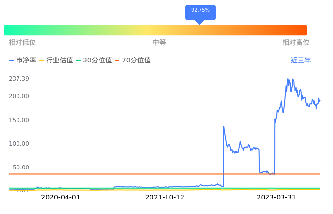 ST凯撒当前市净率PB为194.29,在所属的旅游及景区中,市净率PB排19,前五名分别为中青旅市净率1.78、峨眉山A市净率2.06、三特索道市净率2.40、丽江股份市净率2.48、黄山旅游市净率2.51。ST凯撒当前市净率PB为192.23,超过近3年92.75%的历史数据。