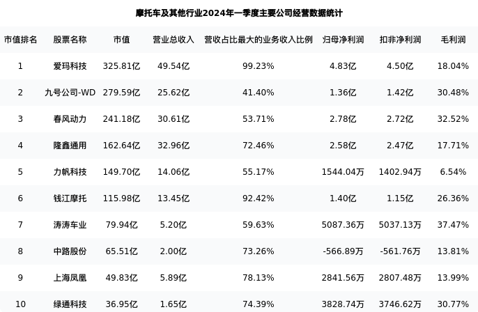 钱江摩托最新报告期数据为一季度,下表汇总了摩托车及其他行业内市值靠前的公司一季度主要经营数据
