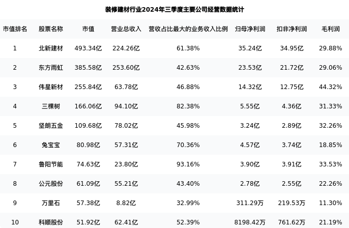 兔宝宝最新报告期数据为三季度,下表汇总了装修建材行业内市值靠前的公司三季度主要经营数据