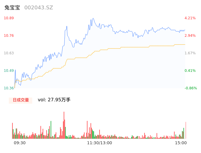 04月29日,兔宝宝收报10.80,股价涨幅3.35%,成交金额2.99亿元,换手率3.83%。