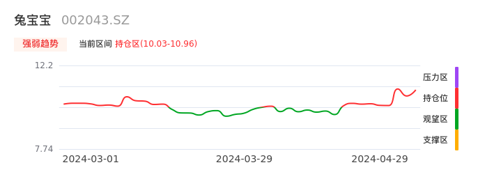 我们来看一下该股的九方特色指标强弱趋势的情况:兔宝宝自04月17日从观望区上穿到持仓区。股价近期在多头区域持续强势上扬,上升动能仍较为充足,可积极关注。后续重点关注上方压力位:10.96元是否能突破上攻。