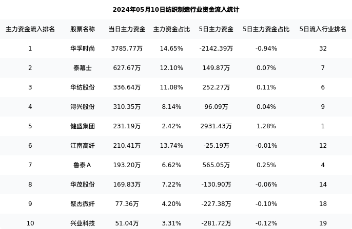 从主力资金流向来看,纺织制造行业今日主力资金流入3.10亿元,在所有申万二级行业中排名:46/131。